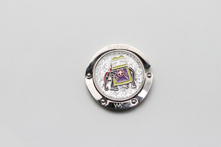 This Bag Hanger has a picture in the center and the sleek silver boarder and hook. This hook is very durable as it holds approximately 20 lbs and fits on most tables. It is made up of Zinc alloy Metal-White Crystal
